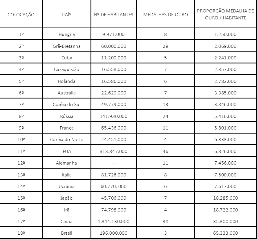 Na tabela, classifica-se o país em relação ao número de habitantes por medalha de ouro. Então, vejamos: