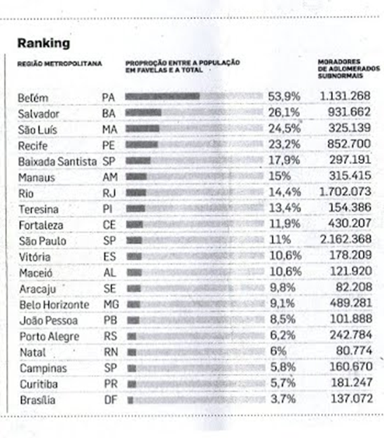A tabela abaixo (imagem do Jornal O Estado de S.Paulo) revela o quadro dramático da situação habitacional no Brasil. Em São Paulo está o maior contingente populacional desses aglomerados. O número de favelados da cidade de São Paulo é equivalente a uma cidade como Belém do Pará, que tem cerca de 2 milhões de habitantes. Esses dados revelam uma situação cruel e dura para os habitantes desses aglomerados. Entretanto, ainda não revela o seu todo, como a população residente em cortiços, pensões, de favor, ou em bairros inteiros cujas condições são semelhantes às de favela, mas não são considerados como tal. São bairros sem esgoto, ruas estreitas, sem acessibilidade, baixa estrutura urbana, habitações construídas em toda a área do terreno, sem sol, sem ventilação. Em muitos casos, não há sinal para celular e a internet não chega. Não vou citar os bairros, mas é fácil verificar. Basta andar pelas periferias das diversas regiões da cidade. Afirmamos, sem receio de errar, que metade da população de São Paulo mora em situação precaríssima.